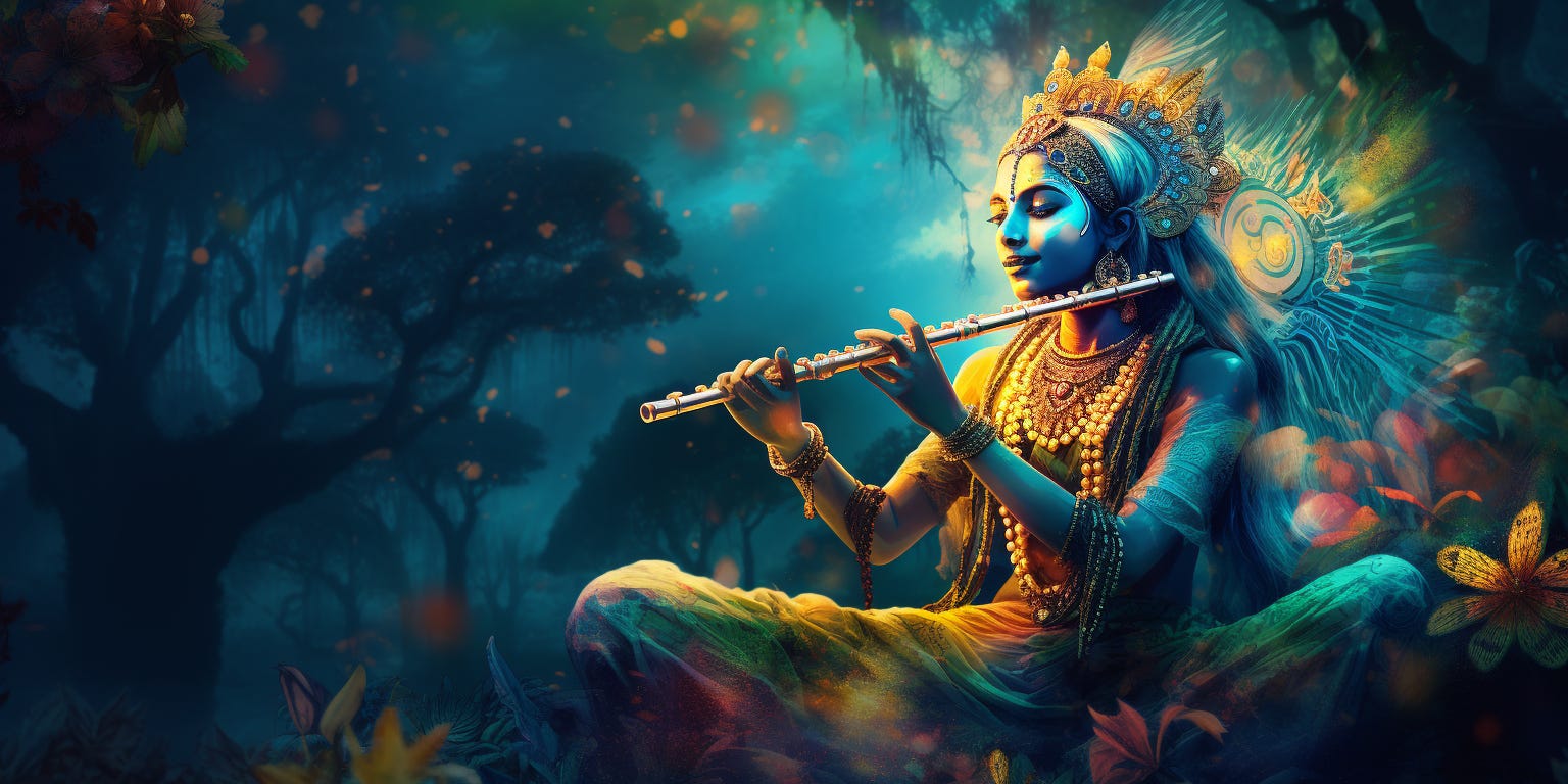 The most famous flute player in the world, more famous than Ron Burgundy even - is Krishna. His flute was said to be so enchanting that people left all of their worldly cares behind to run towards the music and the spiritual life it represented. It didn't matter if they were half-dressed or had something on the stove - they came straight away. Such was the allure of the mystic quality of Krishna and his flute. The yogis tell us that if we try, we can be like Krishna's flute. This is one of the best outcomes for us, really. To have the supreme being hold us to his lips and to fill us with a divine breath that makes us sing so sweetly. We take our place in the sacred symphony of creation. People come to psychedelics to find their purpose. Well, how is that for a purpose? Finding a new job is easy, but try cleaning the mud out of the bamboo of your soul so the music of infinity can pass through it unobstructed; that's the good stuff right there.