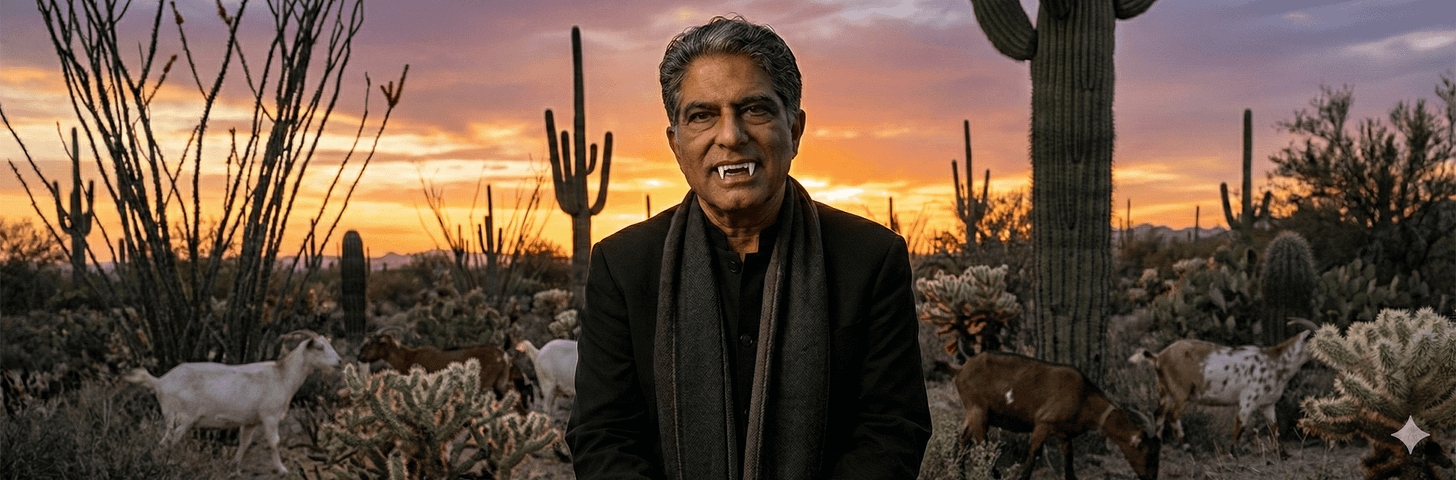One morning, I rolled up to our regular coffeeshop, and as I ordered, I saw a sticker thumbtacked to the bulletin board. It was a xeroed picture of Deepak Chopra with fangs. Under it, the text, “Deepak Chupacabra.”