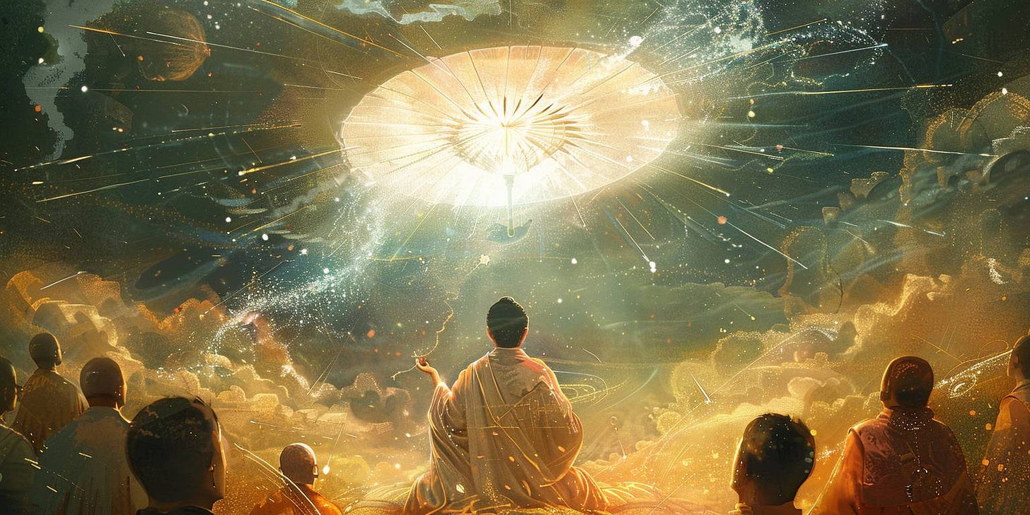 The practice 'wasn't real', but due to his sincerity, it bore fruit, and over the passing years, he started to show signs of authentic spiritual transformation. He developed observable wisdom and compassion and even the ability to heal the sick. It was said that sometimes, in the right light, you could see the faint glowing parasol spinning over his head.